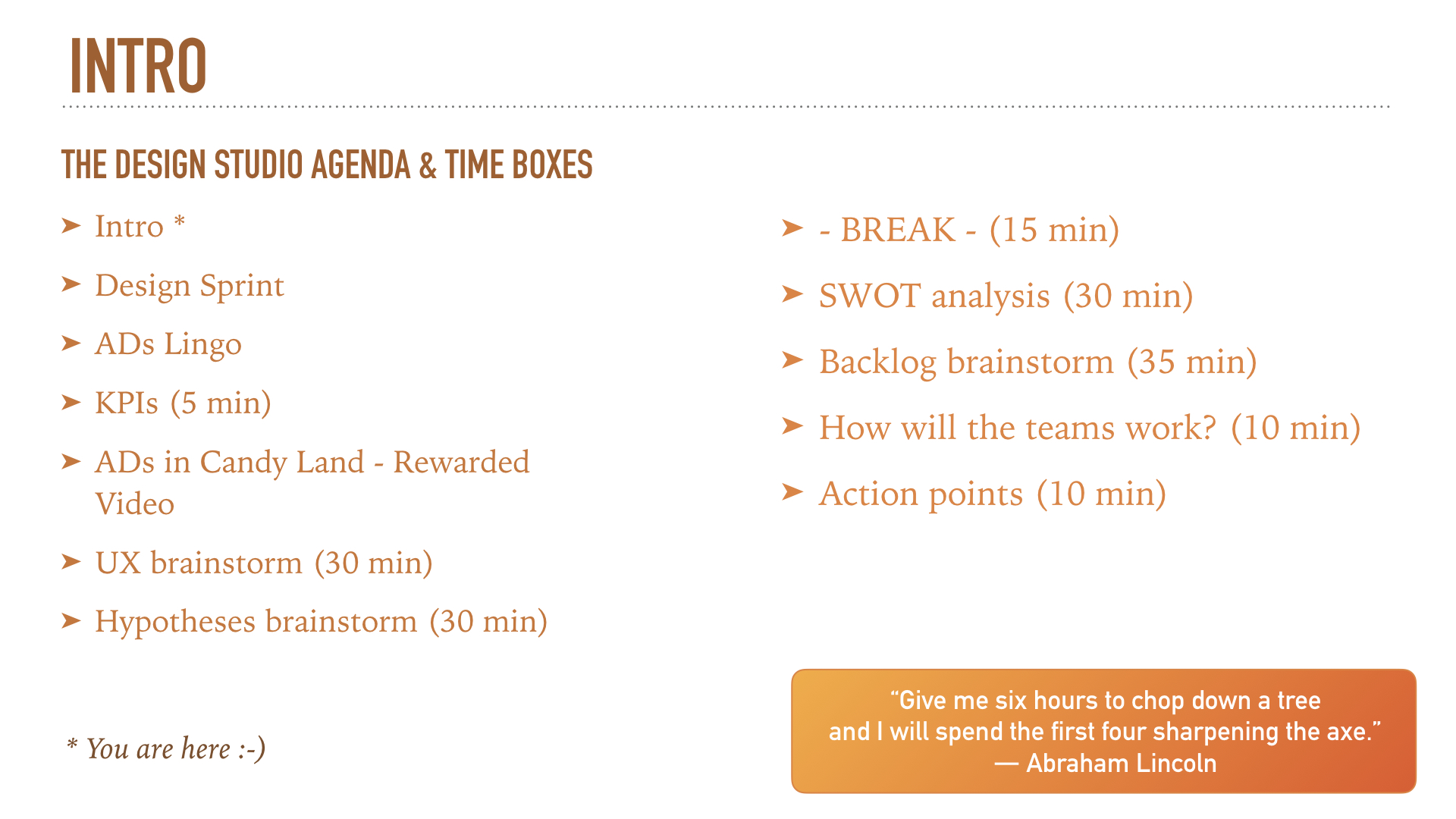 These slides offer a glimpse into the ADs Design Studio workshop I led. I aimed for an engaging presentation with captivating slides, sprinkling in moments of humor to maintain team interest. We took a brief pause, promoting movement to help attendees re-center their attention.