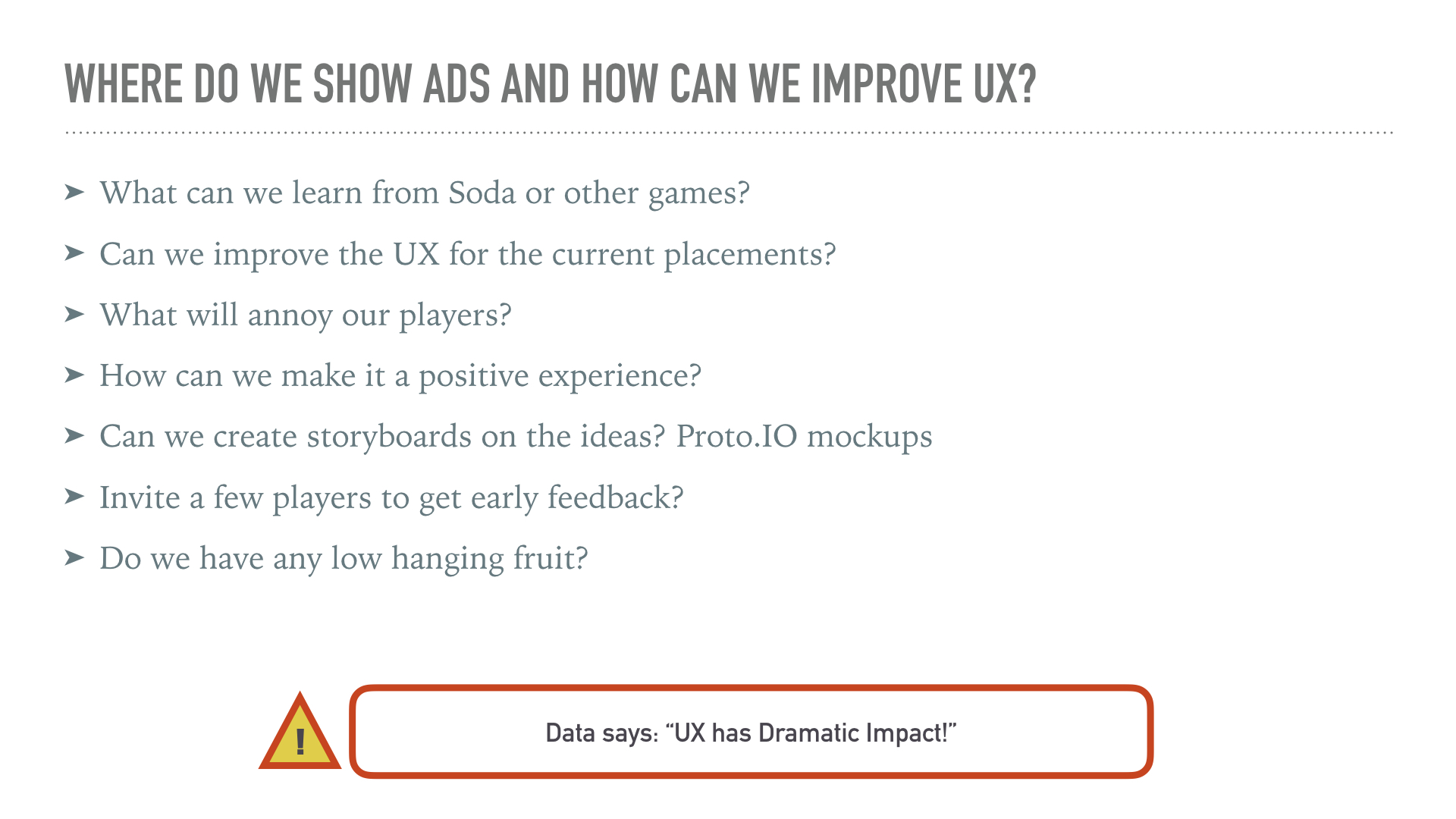 When I transitioned to the Candy Crush Soda game, I identified a need to expand the workshop to encompass not just designers but also developers. Recognizing a knowledge gap among developers, I curated a tech-centric version of the presentation specifically for them, aiming to foster enhanced collaboration with the artists.