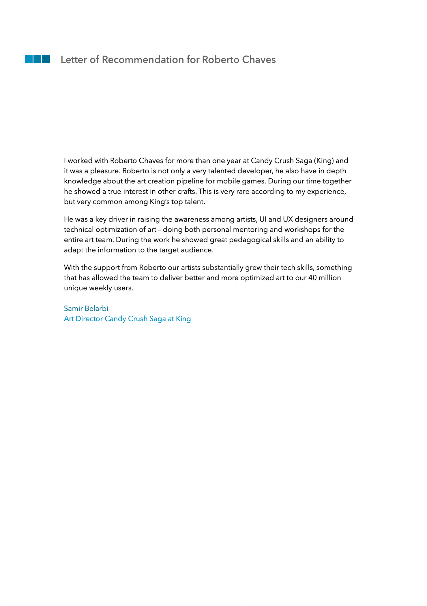 With the support from Roberto our artists substantially grew their tech skills, something that has allowed the team to deliver better and more optimized art to our 40 million unique weekly users.”