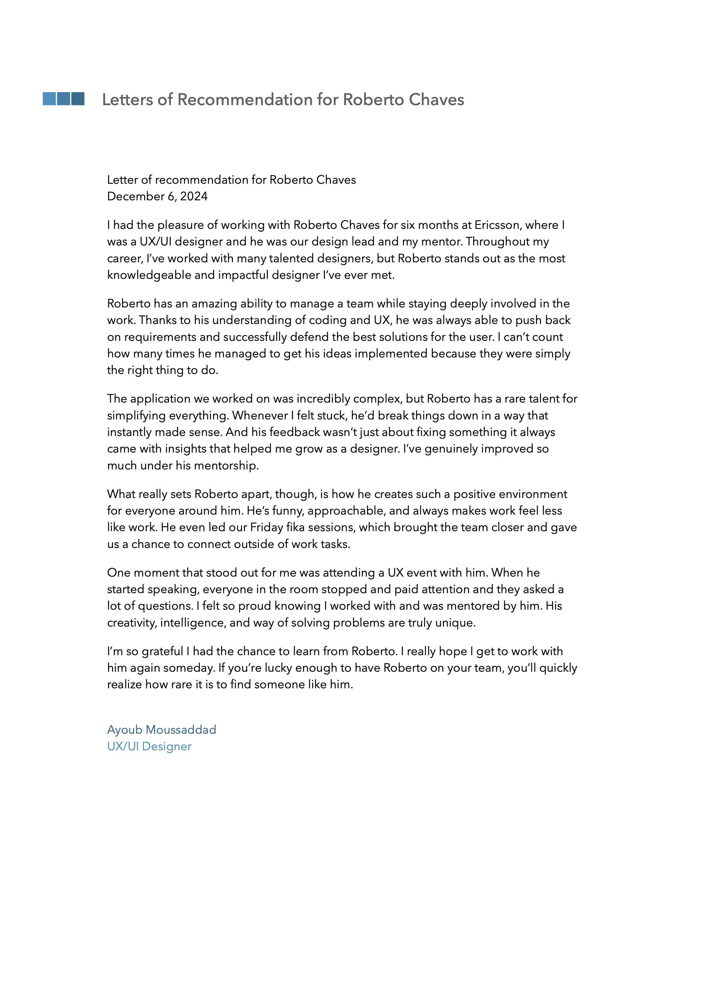 “What really sets Roberto apart, though, is how he creates such a positive environment for everyone around him. He’s funny, approachable, and always makes work feel less like work. He even led our Friday fika sessions, which brought the team closer and gave us a chance to connect outside of work tasks"