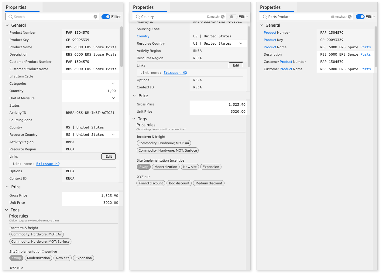Properties panel search functionality