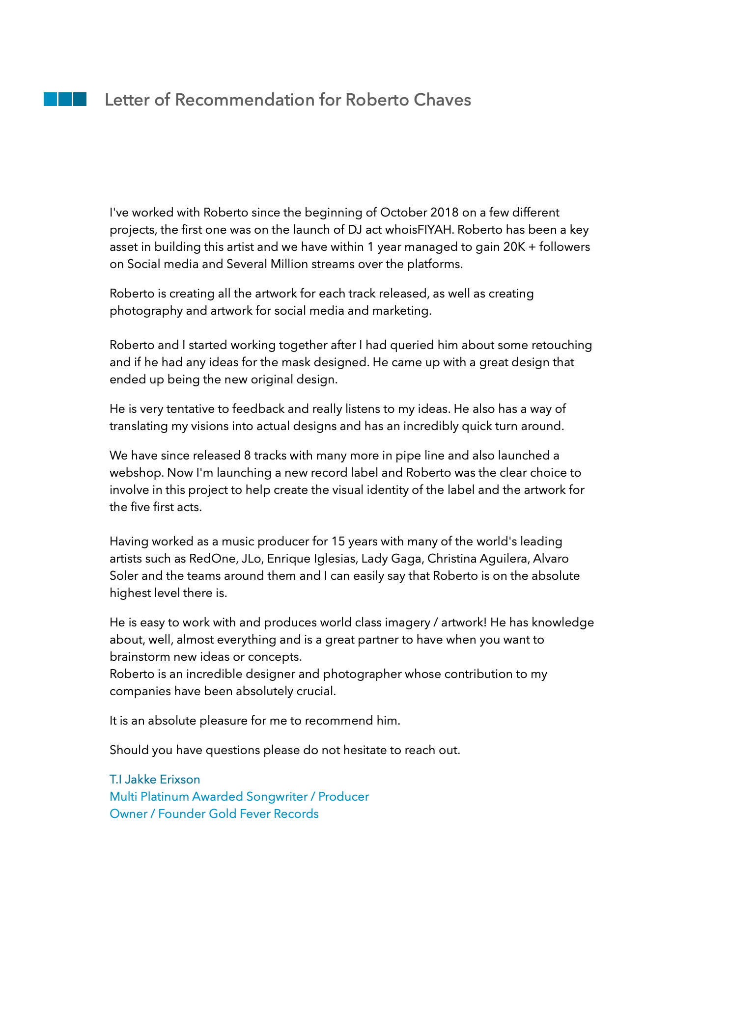 “Having worked as a music producer for 15 years with many of the world’s leading artists such as RedOne, JLo, Enrique Iglesias, Lady Gaga, Christina Aguilera, Alvaro Soler and the teams around them and I can easily say that Roberto is on the absolute highest level there is.