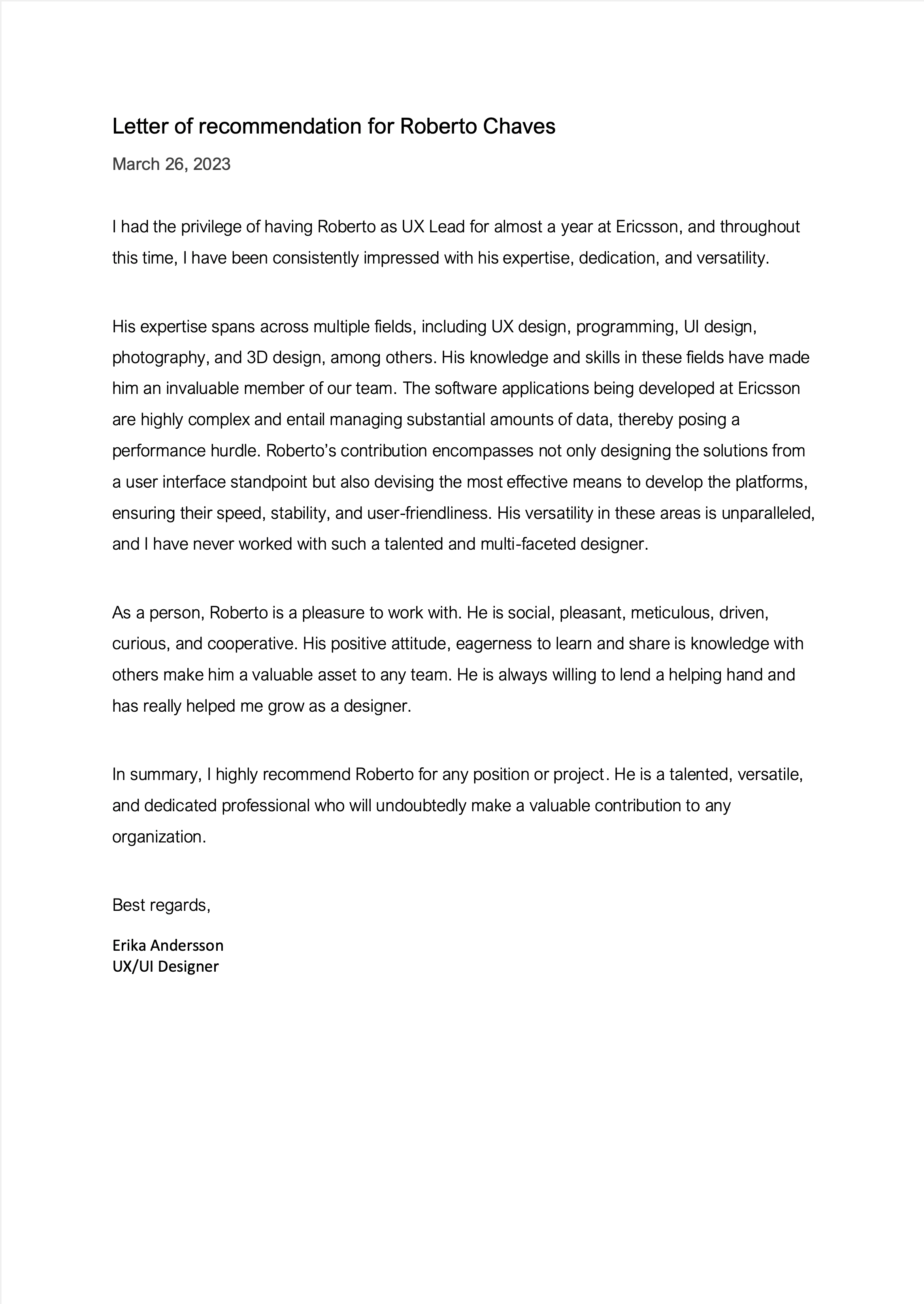 As a person, Roberto is a pleasure to work with. He is social, pleasant, meticulous, driven, curious, and cooperative. His positive attitude, eagerness to learn and shares his knowledge with others make him a valuable asset to any team. He is always willing to lend a helping hand and has really helped me grow as a designer.”